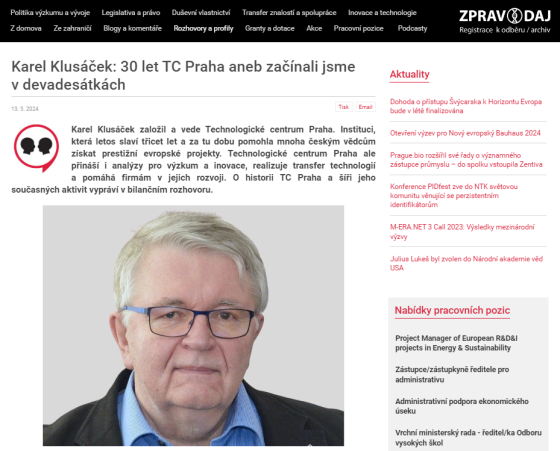 Karel Klusáček založil a vede Technologické centrum Praha. Instituci, která letos slaví třicet let a za tu dobu pomohla mnoha českým vědcům získat prestižní evropské projekty. Technologické centrum Praha ale přináší i analýzy pro výzkum a inovace, realizuje transfer technologií a pomáhá firmám v jejich rozvoji. O historii TC Praha a šíři jeho současných aktivit vypráví v bilančním rozhovoru.